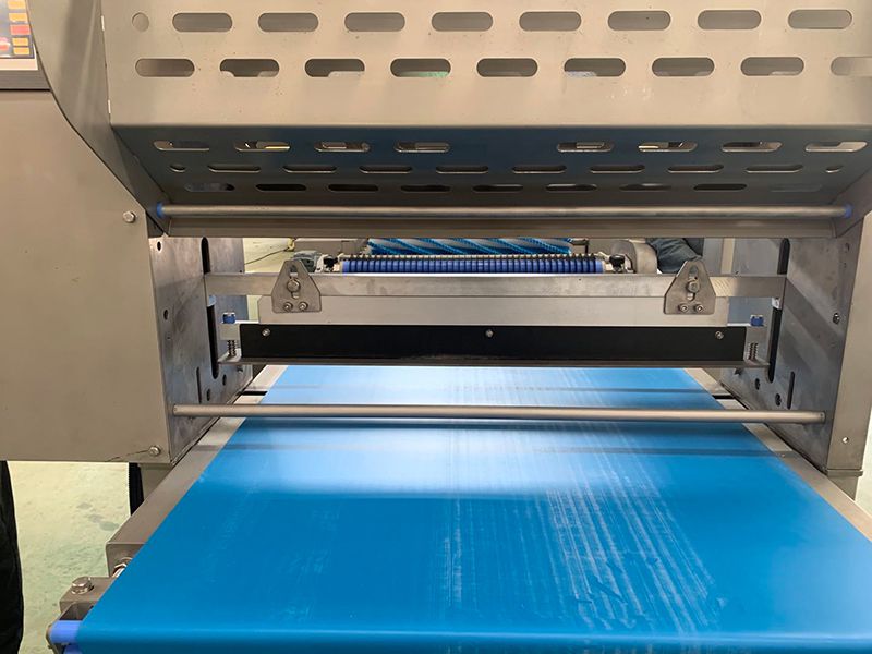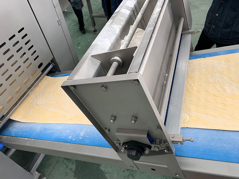 لتقسيم العجين المختلط إلى قطعتين، وبثق حزم قطع العجينة باستمرار. يتم بثق حزمة العجين 600 مم؛ يمك ضبط السمك من 1.5 إلى 2.5 سم؛ بفضل العجلات يمكن بكل سهولة تحريكها لغرض التنظيف والصيانة. - وحدة المعايرة