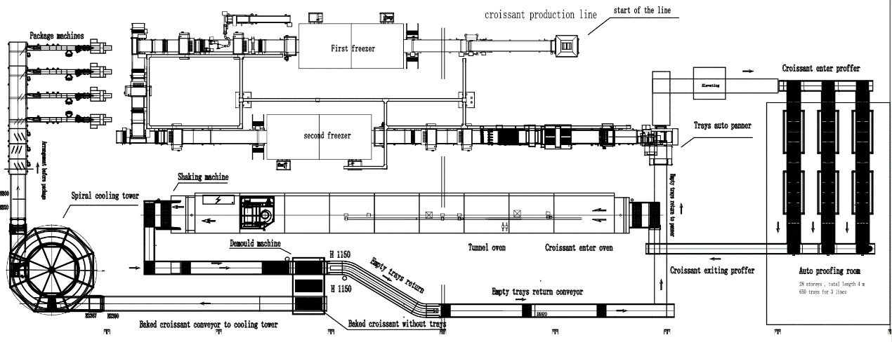 هذا الخط يتكون من خط تشكيل عجينة الكرواسون الآلي، معالجة التخمر الآلية، نظام تبريد المحمص والتعبئة والتغليف. وبالتالي فإن هذا النوع من الخطوط يتطلب مساحة أكثر للمصنع وكذلك قيمة أكثر للاستثمار.